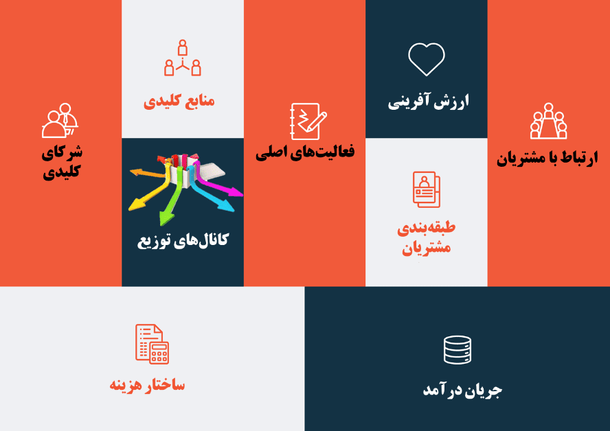 این ۹ مؤلفه شامل: بخش‌بندی مشتریان، ارتباط با مشتری، کانال‌های توزیع، بیانیه ارزش، منابع اصلی، فعالیت‌های کلیدی، شرکا، ساختار هزینه و جریان درآمد می‌باشد. بوم مدل کسب و کار ابزاری قدرتمند برای تجسم واضح تمام مؤلفه‌ها و ارتباط بین آن‌ها می‌باشد که در شکل زیر نمایش داده‌شده است.