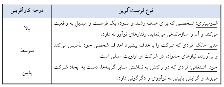 در برخی مطالعات نیز تأکید شده که فرصتآفرین با مدیر-مالک متفاوت است. شرکتهای جدید با دو دسته انگیزه متفاوت تأسیس میشوند: